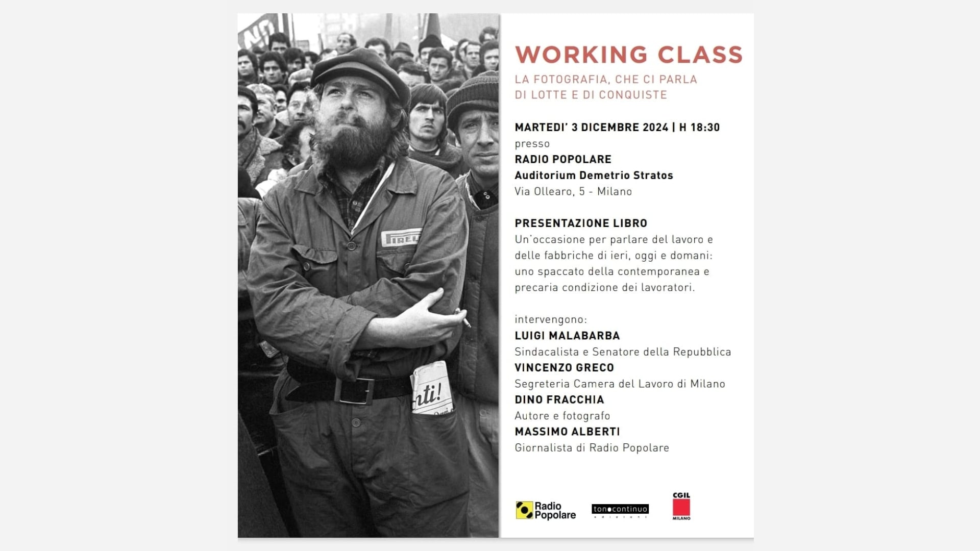 Radio Popolare martedì 3 dicembre ospiterà nell’Auditorium Demetrio Stratos di via Ollearo 5 alle ore 18:30 la presentazione del libro “WORKING CLASS. La Fotografia, che ci parla di lotte e di conquiste”, un’occasione per parlare del lavoro e delle fabbriche di ieri, oggi e domani: uno spaccato della contemporanea e precaria condizione dei lavoratori.